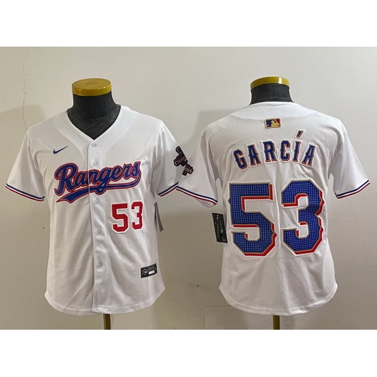 Home>MLB>Texas Rangers>Youth>Youth Texas Rangers 53 Adolis Garcia White Gold Cool Base Stitched Baseball Jersey